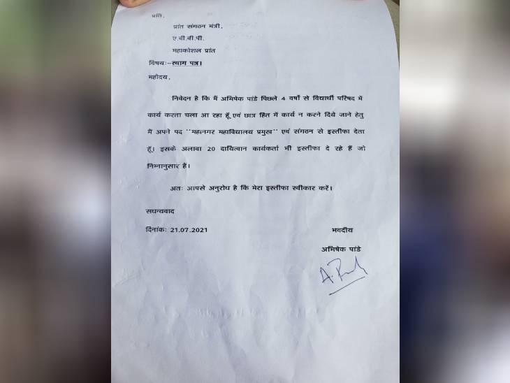 अभिषेक पांडे ने कहा कि महाविद्यालयों और विश्वविद्यालयों में छात्रों से जुड़ी ढेरों समस्याएं हैं, लेकिन लॉकडाउन के बाद से ही संगठन पदाधिकारियों द्वारा कोई आंदोलन करने से रोका जा रहा था। पदाधिकारियों को बर्दाश्त करने की नसीहत दी जा रही थी। जबकि छात्रों के बीच में रहकर उनकी आवाज न उठाने पर उनकी भूमिका को संदेह से देखा जा रहा था। इसी कारण वे इस्तीफा देने पहुंचे थे। अब सभी पदाधिकारी नया छात्र संगठन बनाकर छात्रों की आवाज दमदारी से उठाएंगे। मामले में सीएसपी आलोक शर्मा ने बताया कि दोनों पक्षों में बात इतनी थी कि एक पक्ष इस्तीफा देने पहुंचा था और दूसरा पक्ष इसे ले नहीं रहा था। बाद में समझा बुझाकर किसी तरह मामला शांत कराया गया।